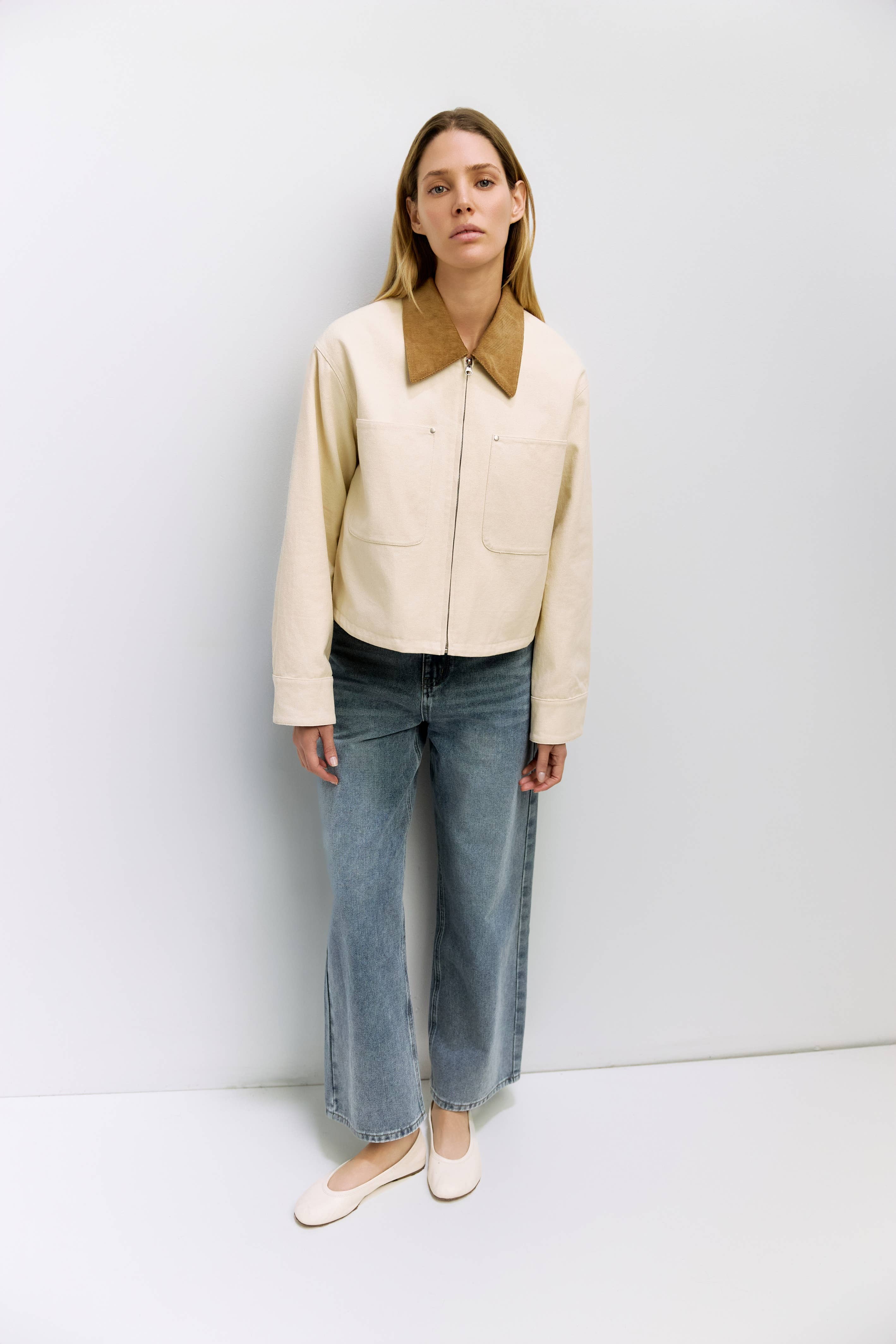 crafted from heavy duck twill with a fully lined interior, the foxglove jacket features a contrast crewneck collar, full zipper, and patch pockets with rivet details. long sleeves with partial cuffs and back pleats offer ease of movement, while the relaxed fit blends practicality with contemporary style.