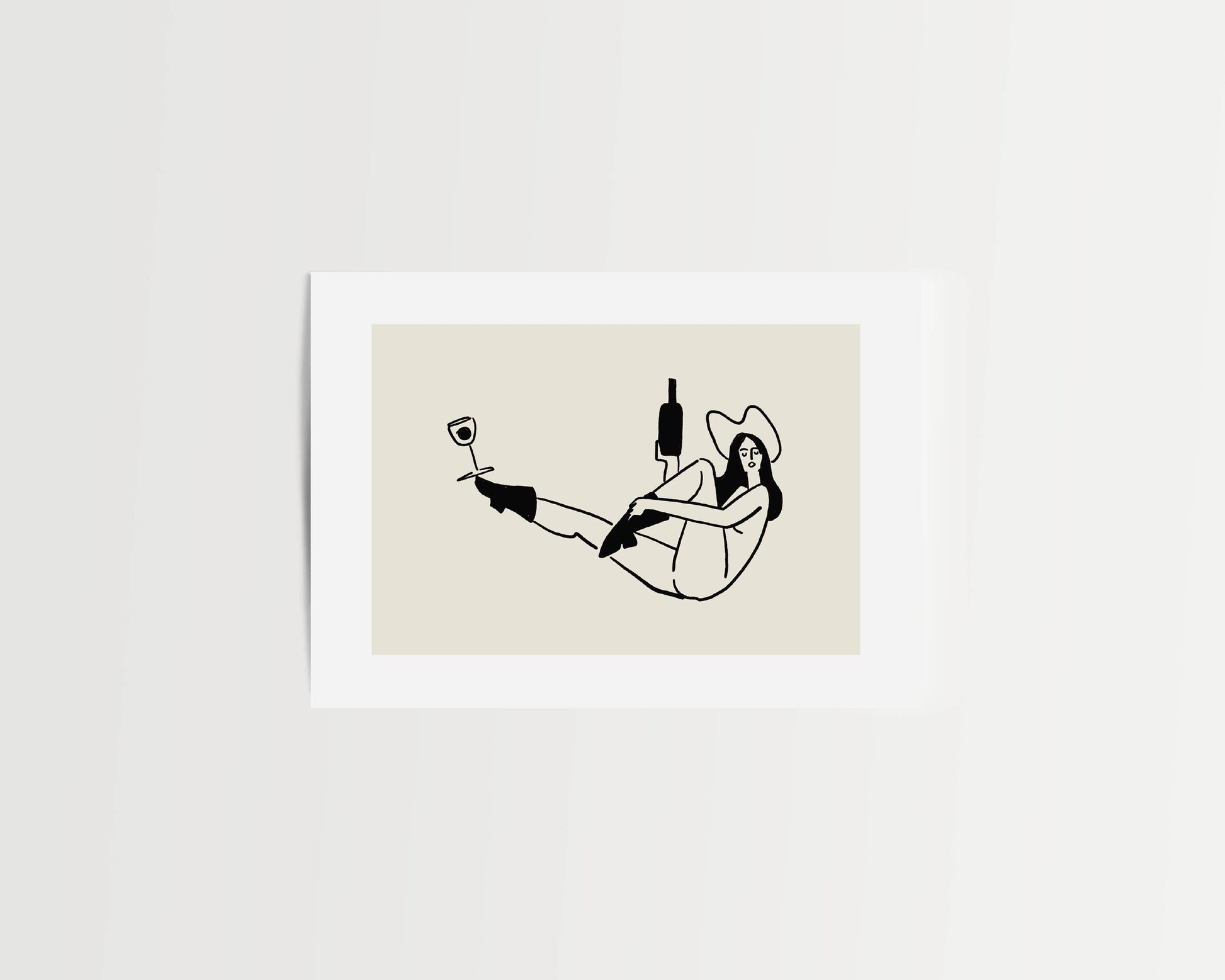 This playful art print captures the perfectly relatable balance of modern western life—a cowgirl striking a yoga pose while holding a bottle of wine. With bold, hand-drawn marker lines and a minimal, sketchy style, it blends humor, simplicity, and vintage flair. Perfect for bohemian, modern, or western-inspired spaces, it makes a statement with both personality and charm.