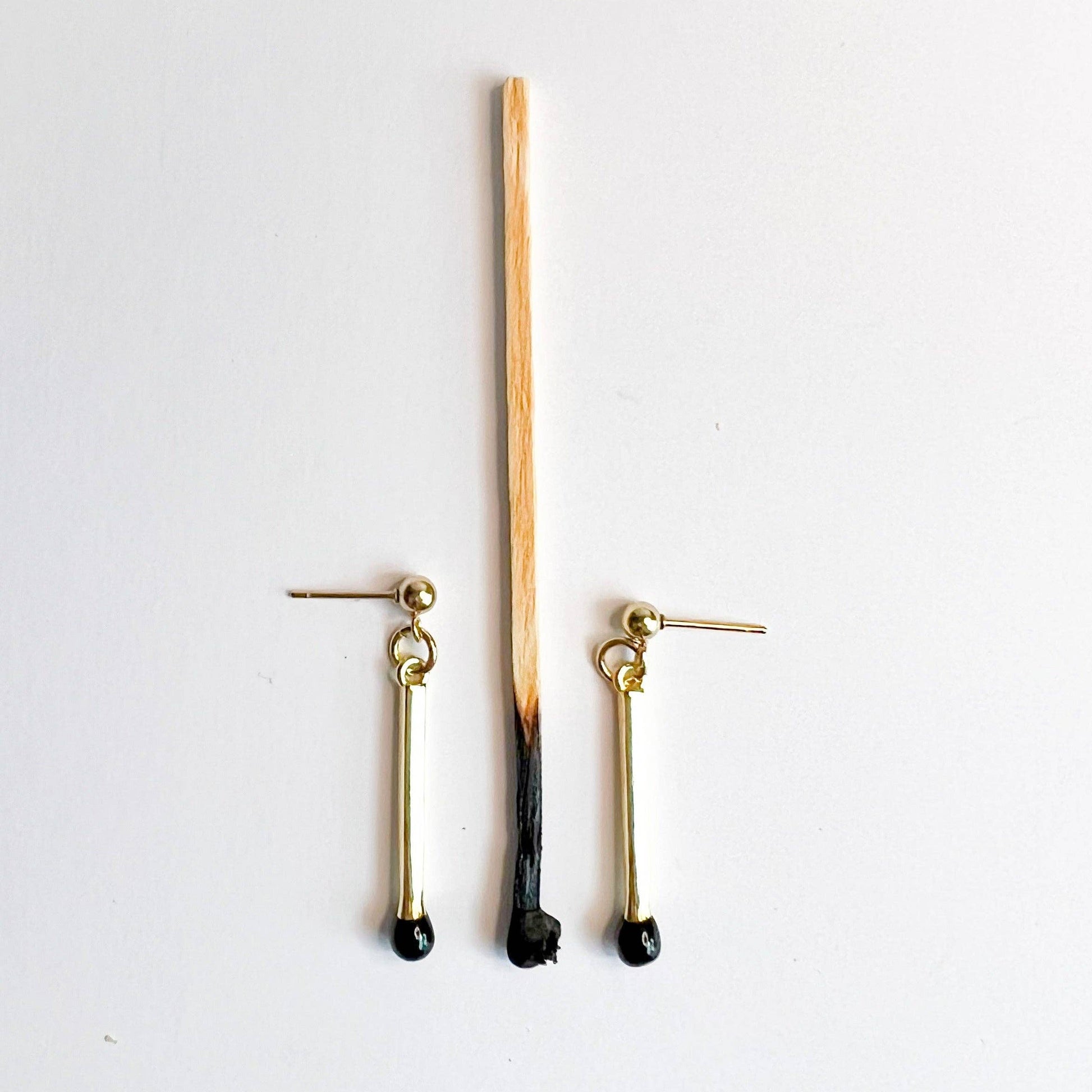 a striking twist on the original matchstick design — the burnt out earrings balance whimsy with edge. featuring 18k gold–plated matchstick pendants with charred black tips, each pair feels like wearable art. lightweight and distinctive, they make an effortless conversation piece.