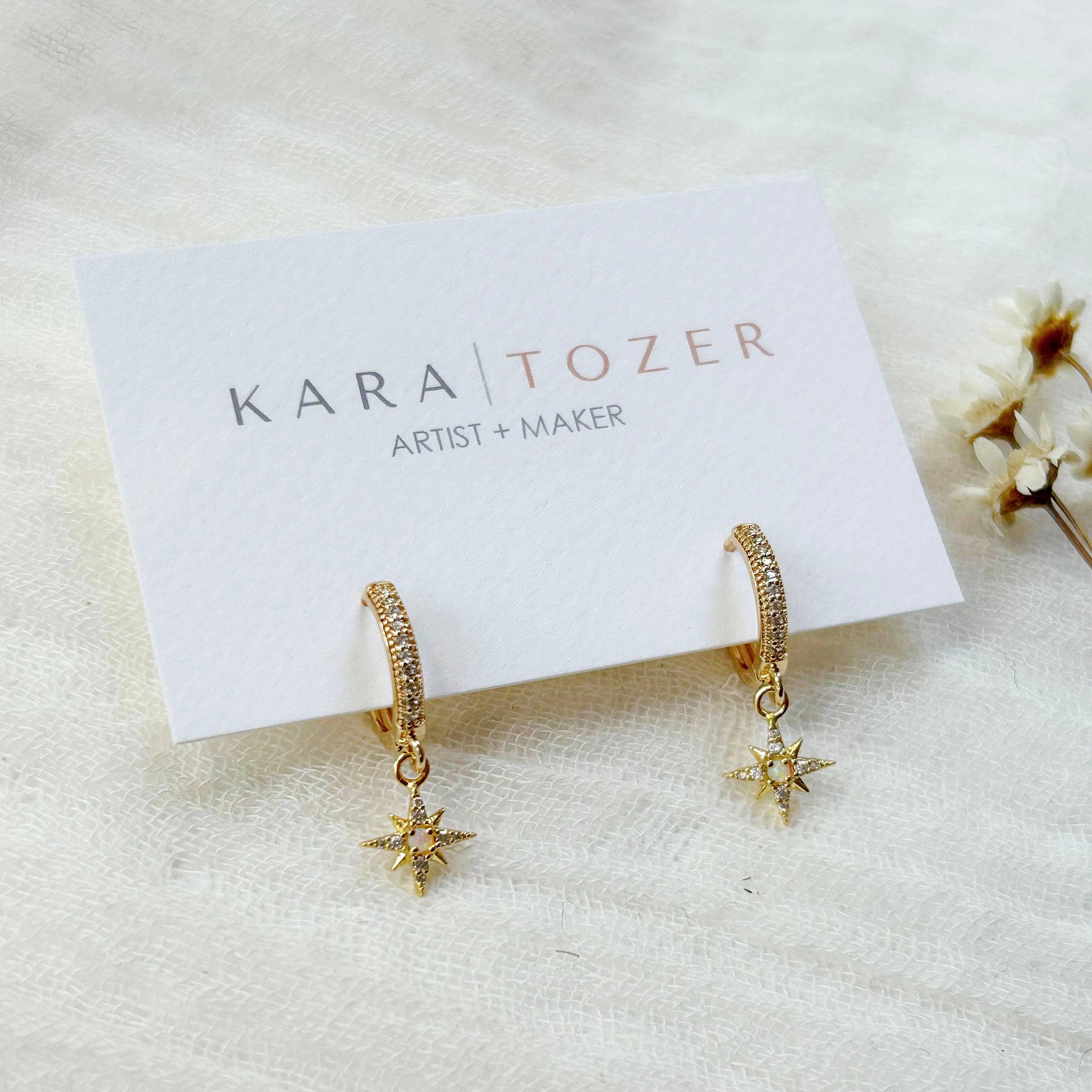 delicate opal star charms lend a soft, celestial glow to these gold-plated hoops. perfect for stacking or wearing solo for a touch of shimmer. made in the usa by kara tozer.
