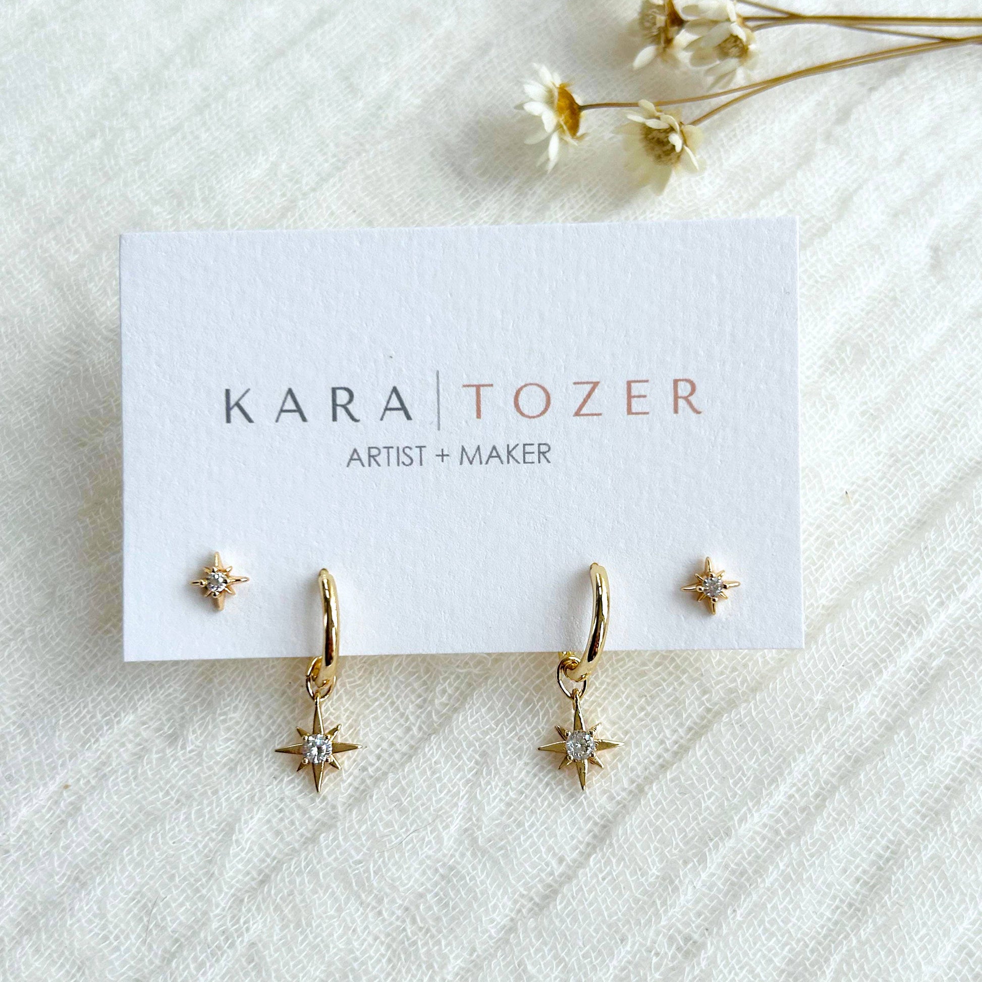 a sweet, celestial duo perfect for gifting (or keeping). this set includes kara tozer’s classic gold hoops with removable star charms plus matching star studs — made to mix, match, and layer with your everyday pieces. an easy, thoughtful set for anyone who loves a little sparkle.