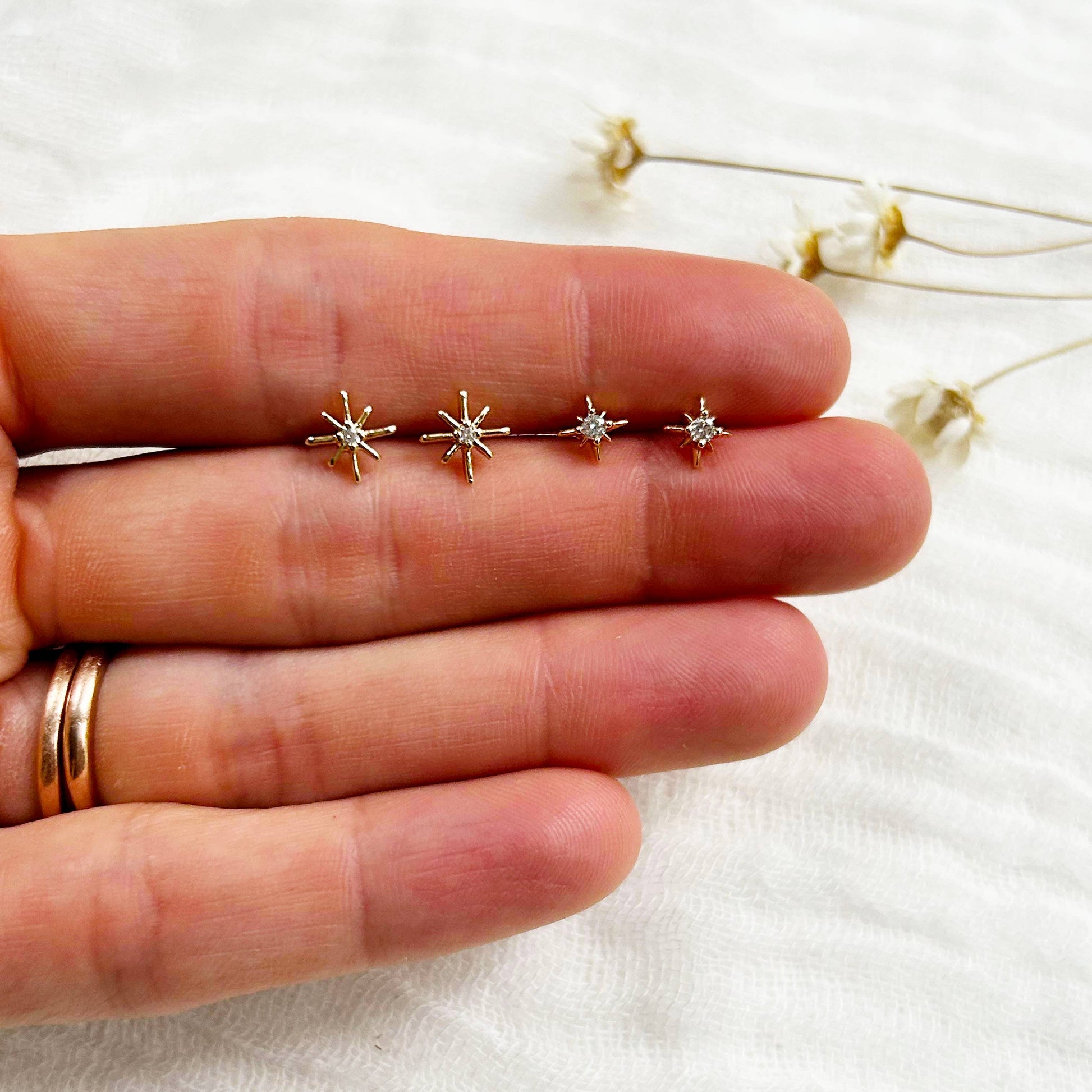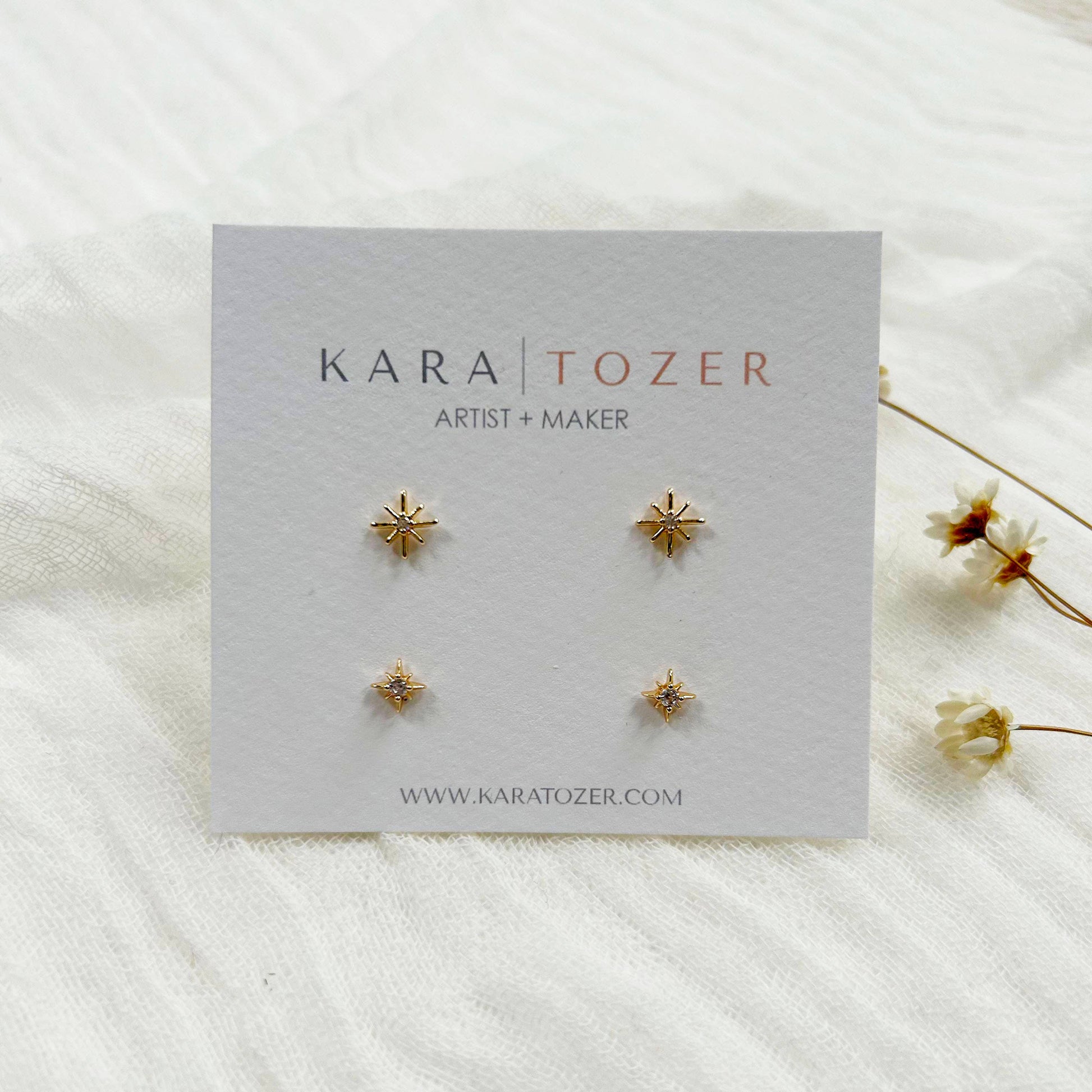 a delicate pairing of star studs for the minimalist who loves a little sparkle. crafted in gold-plated brass with cubic zirconia stones, this set is made for mixing, stacking, and gifting. made in the usa by kara tozer.