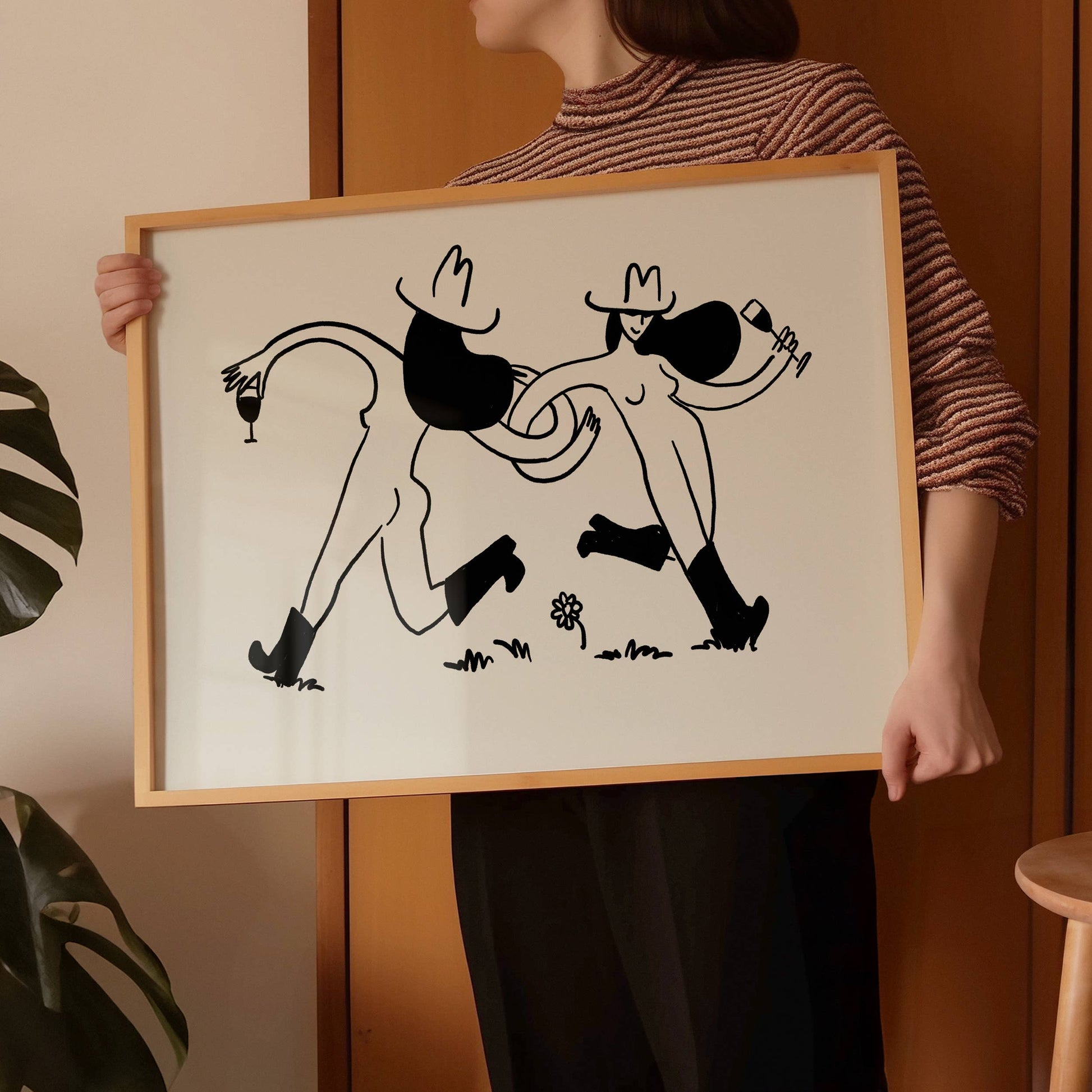 Two carefree cowgirls, a field of spring grass, and a glass of wine—this whimsical print captures simple joys with playful, hand-drawn charm. Its sketchy linework and imperfect details make it feel delightfully alive, bringing a touch of humor and western spirit to any space.