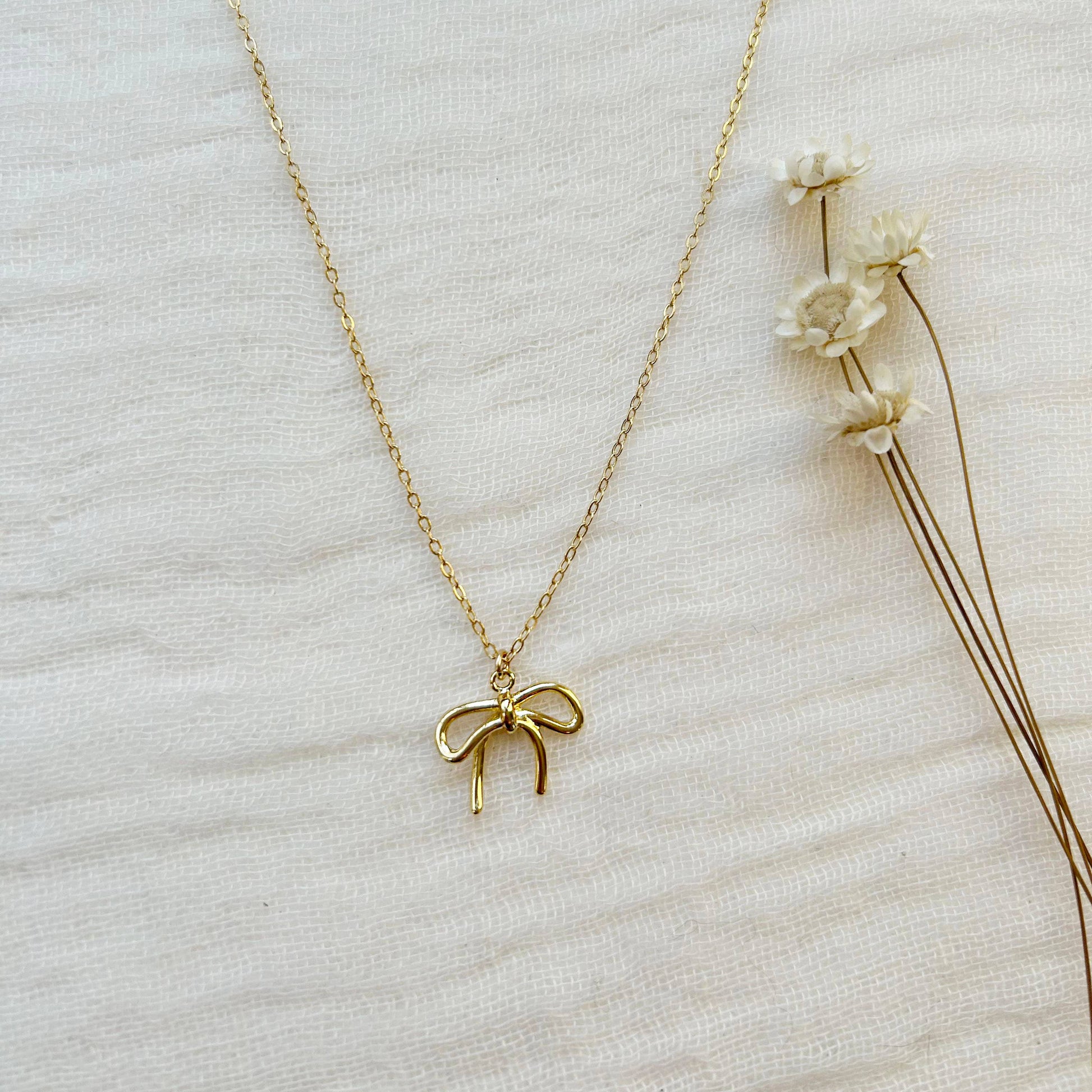 a delicate nod to vintage charm — this dainty gold bow necklace adds a touch of understated elegance to any look. made in york, pennsylvania, it layers beautifully with other chains or stands alone as a subtle statement for the season. a perfect mix of feminine and timeless.