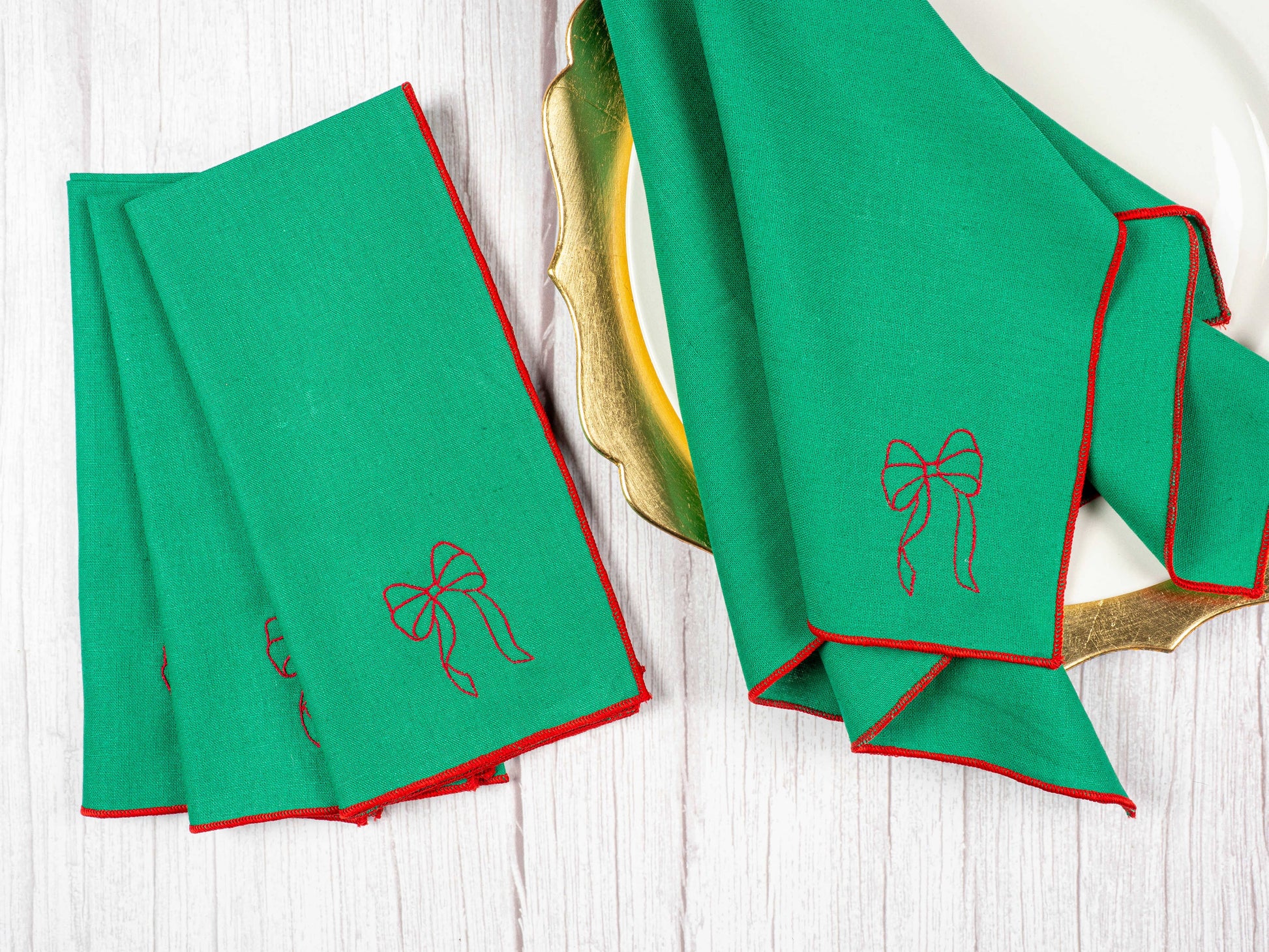 a cheerful, classic touch for holiday gatherings. these linen-blend napkins from dot & army feature a hand-embroidered red bow on vibrant green fabric — the perfect way to bring color and care to your winter table.