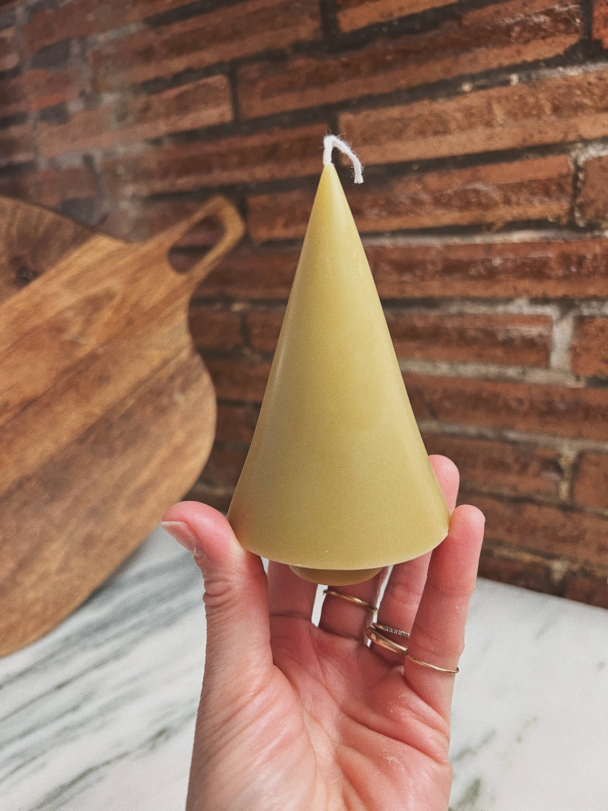this minimalist beeswax cone candle adds a warm, modern touch to any space. hand-poured in small batches using 100% pure beeswax, it burns with a soft, natural glow and a subtle honeyed scent. standing approximately 5 inches tall, it’s perfect for styling on a mantle, bookshelf, or holiday centerpiece.