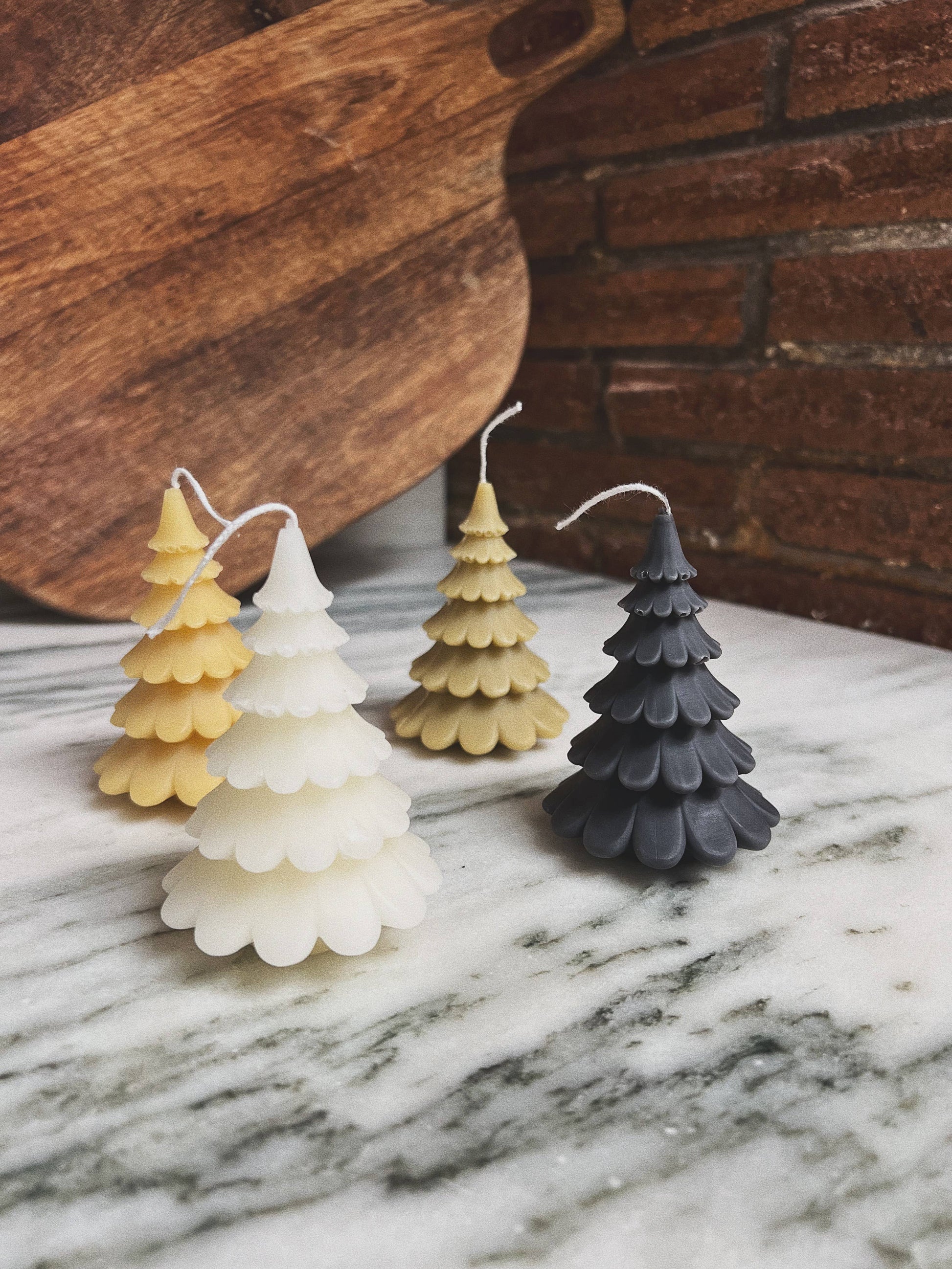 this scalloped beeswax tree candle brings a soft, whimsical touch to your winter decor. each layer is delicately shaped, giving it a sweet, textured silhouette that looks beautiful on a mantle, bookshelf, or holiday tablescape. hand-poured in small batches using 100% pure beeswax, it offers a warm, natural glow and a subtle honey aroma. approximately 4 inches tall — perfect on its own or paired with the taller styles.