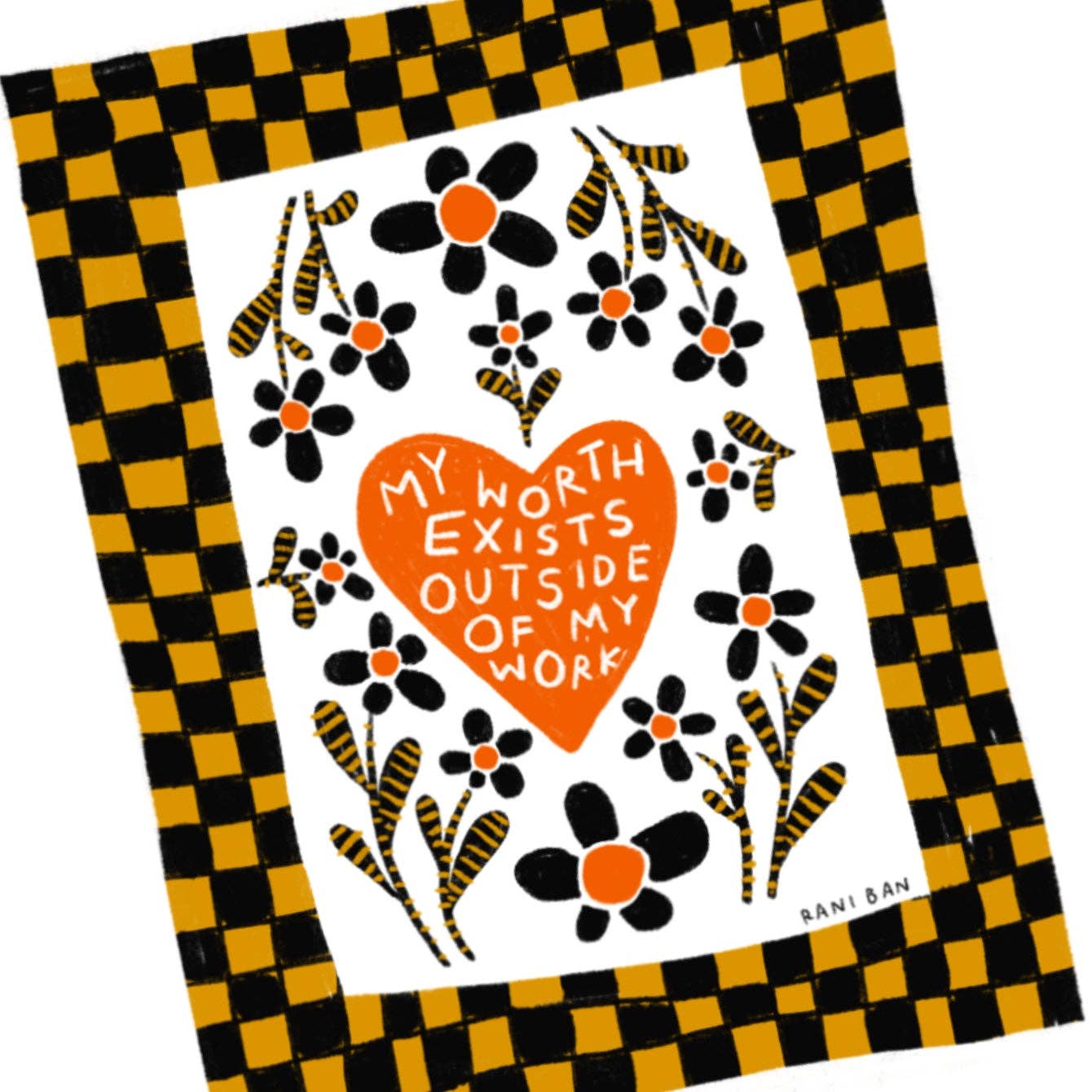 a daily reminder worth keeping close. this 8.5x11 art print by rani ban reads ‘my worth exists outside my work,’ framed by a folk-inspired floral and quilt motif. printed on textured stock that looks beautiful framed, pinned to your wall, or tucked on your desk as a quiet nudge of encouragement.