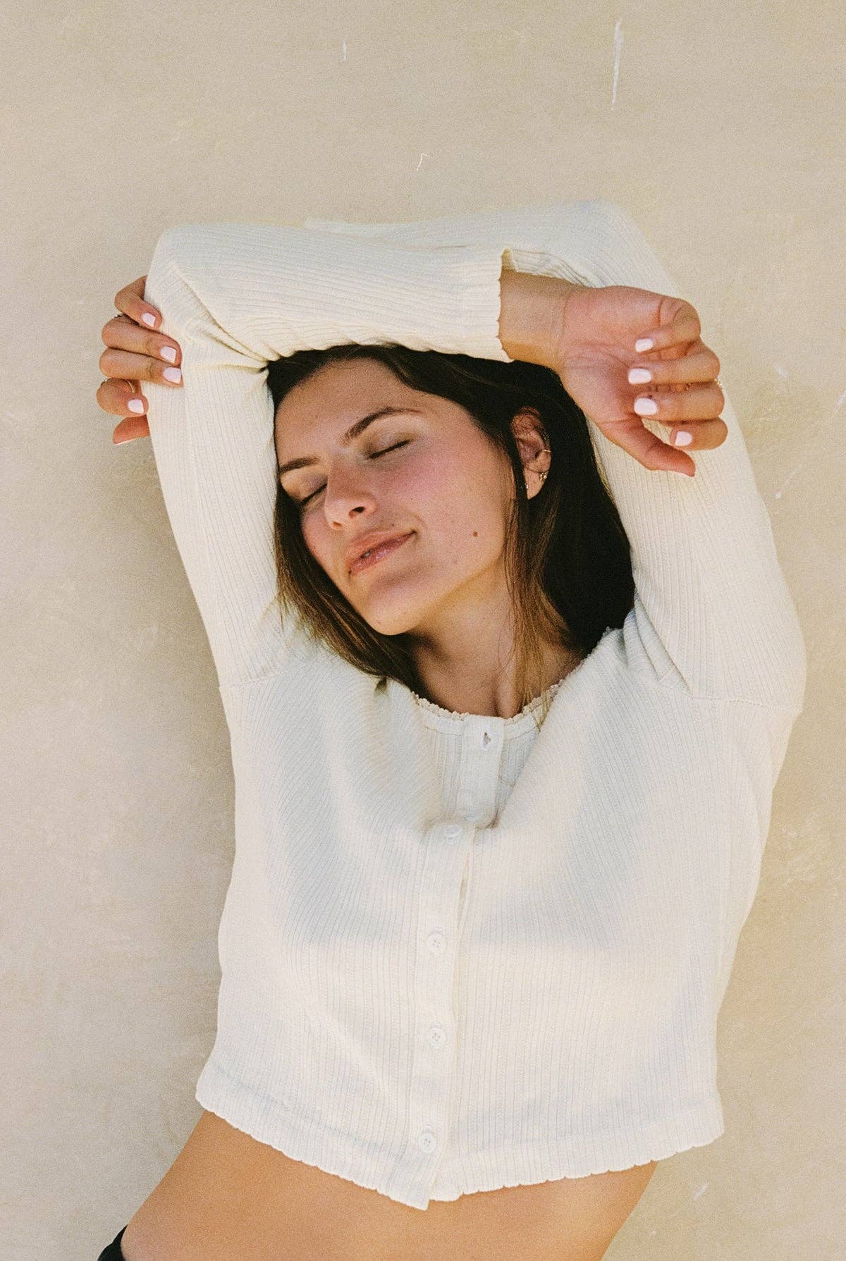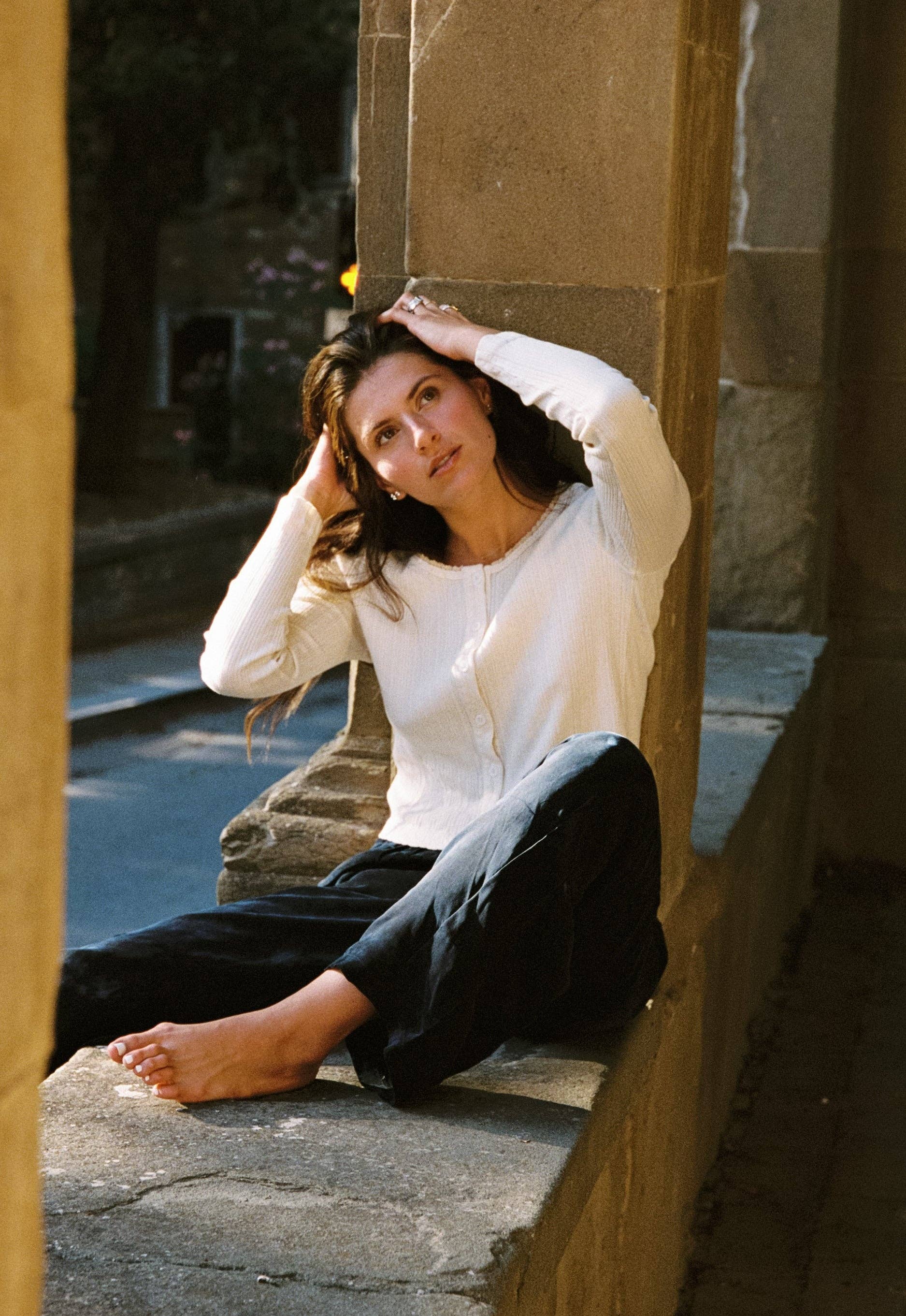 our sweetest layer. the Llyria Pointelle Cardigan brings a touch of romance to everyday dressing with pearlescent buttons and delicate cotton lace trim at the neckline. crafted from organic cotton pointelle knit, it’s gently cropped with bracelet-length sleeves for a subtly vintage silhouette that pairs effortlessly with denim, trousers, or your favorite slip skirt.