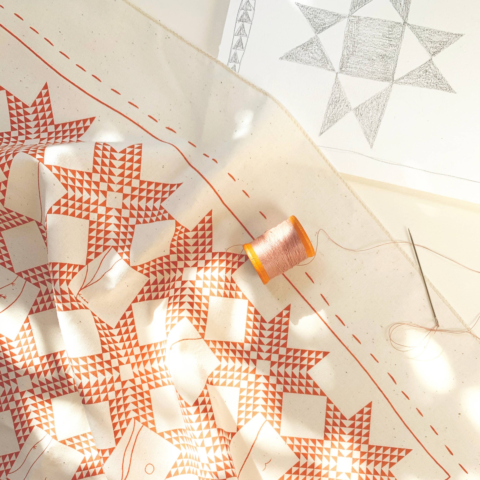 Inspired by quilt motifs and meandering landscapes, this design captures the feeling of lineage and connection — like memories held in fabric, or stars guiding travelers home. Hand screen-printed with water-based ink, the Quilt Bandana is ethically made from 100% unbleached cotton and crafted to be worn, tied, wrapped, or displayed.