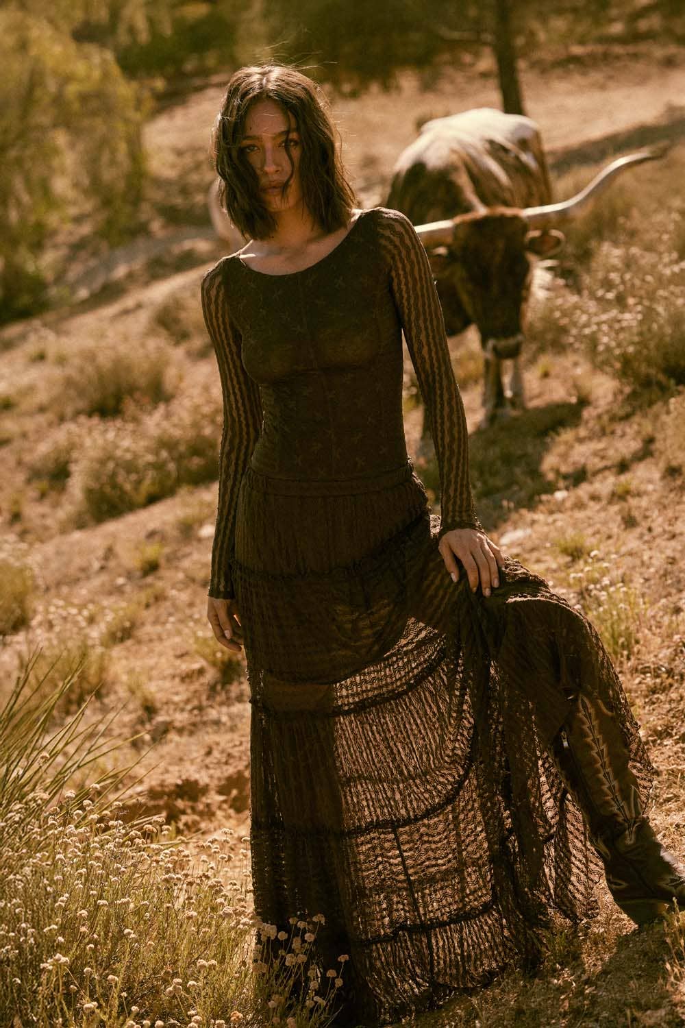 The Paloma Skirt is a tiered lace maxi with effortless movement and subtle western edge. Designed with a comfortable elastic waist, partial lining, and soft lettuce-edge ruffles, it’s a statement piece that feels both free-spirited and timeless.