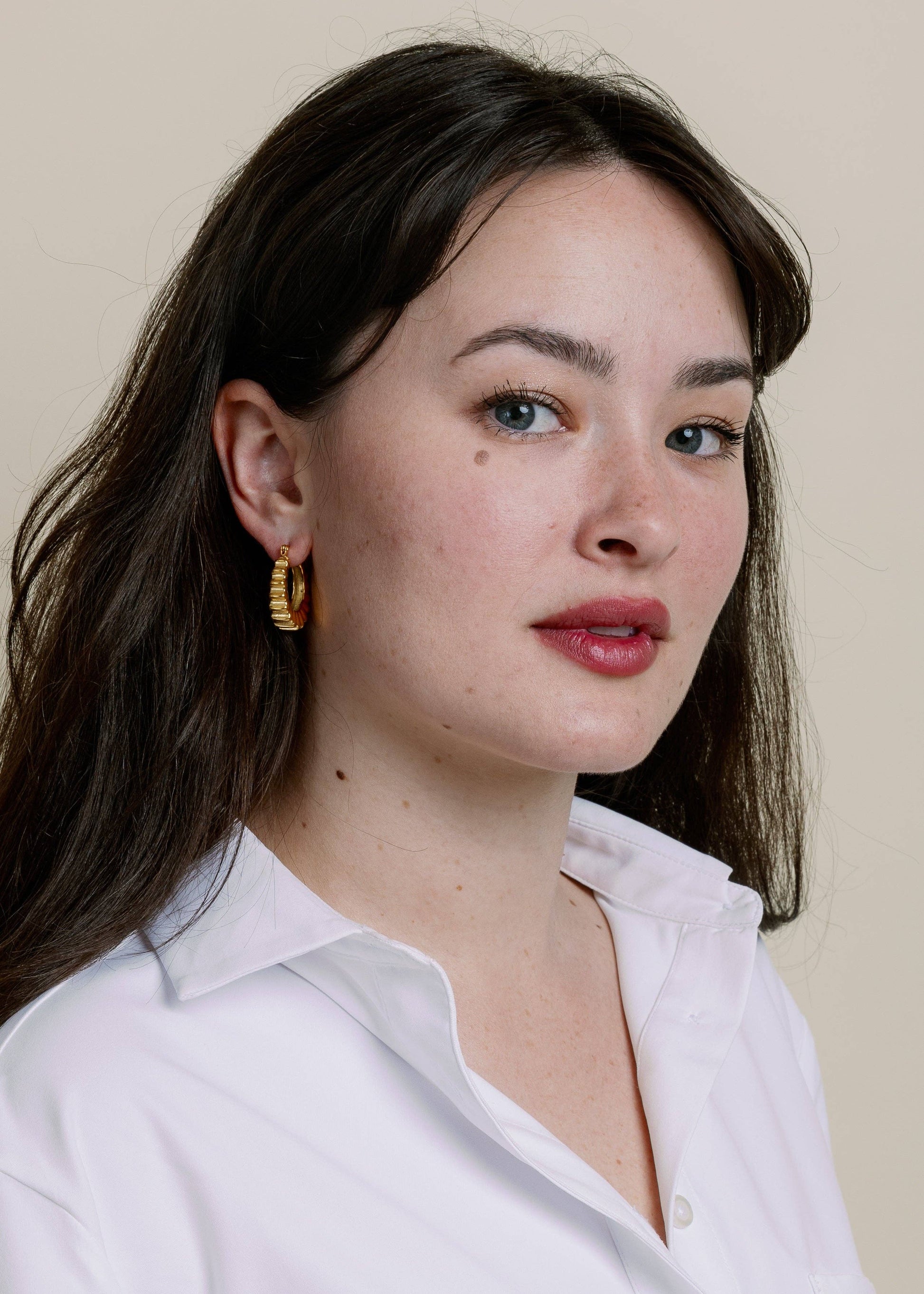 a sculptural gold hoop defined by a softly scalloped edge and polished finish. bold in texture yet balanced in shape, this pair adds dimension and interest while remaining easy to wear day to day. refined but not precious, these hoops bring a touch of character to everyday looks without overwhelming them. crafted in stainless steel, they’re waterproof, tarnish resistant, and hypoallergenic for comfortable, long-lasting wear.