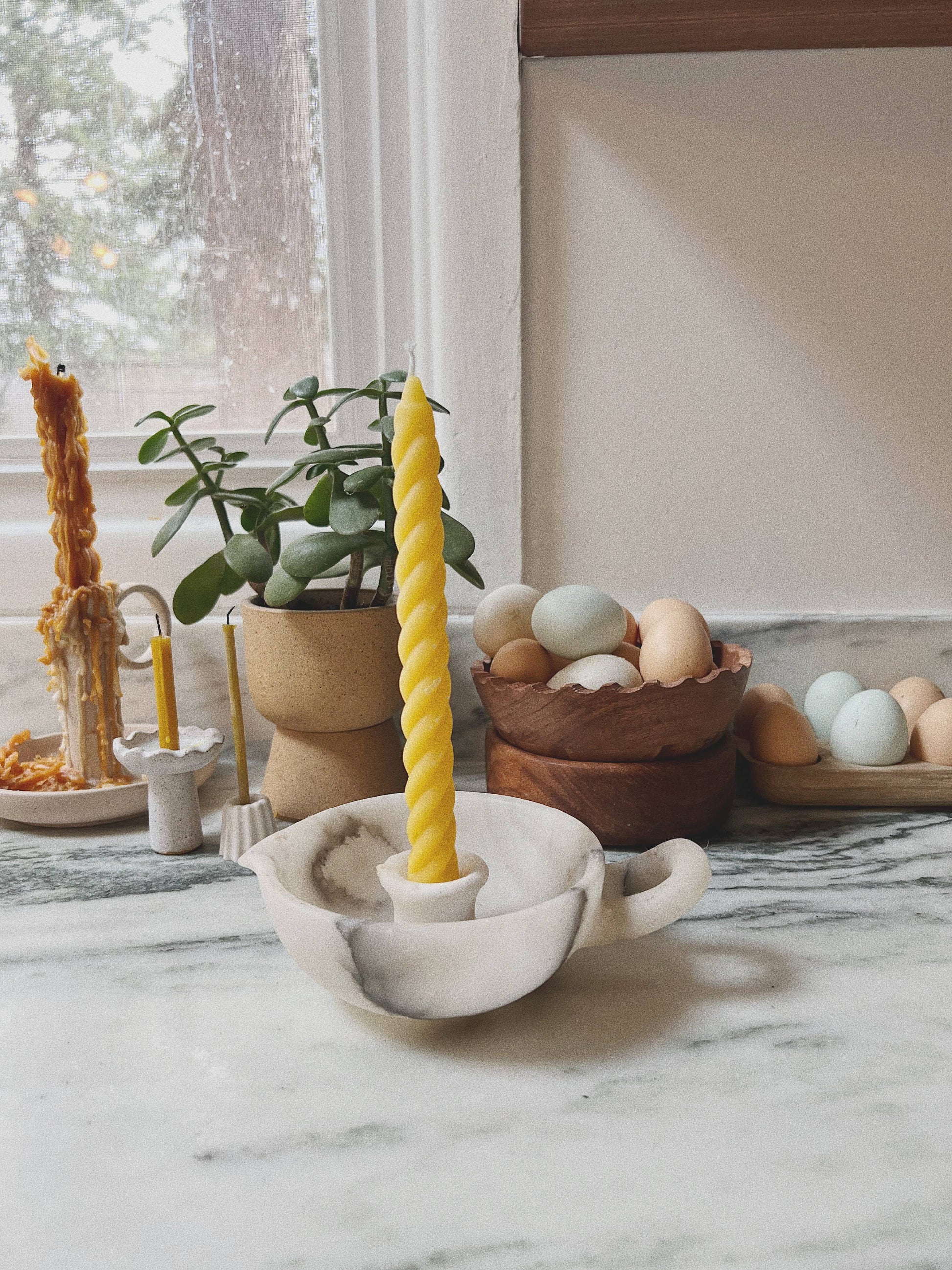 hand-poured in portland, oregon, these twisted tapers combine timeless form with a playful, sculptural twist. crafted from 100% pure beeswax, each pair burns cleanly and adds a warm, golden glow to your space.