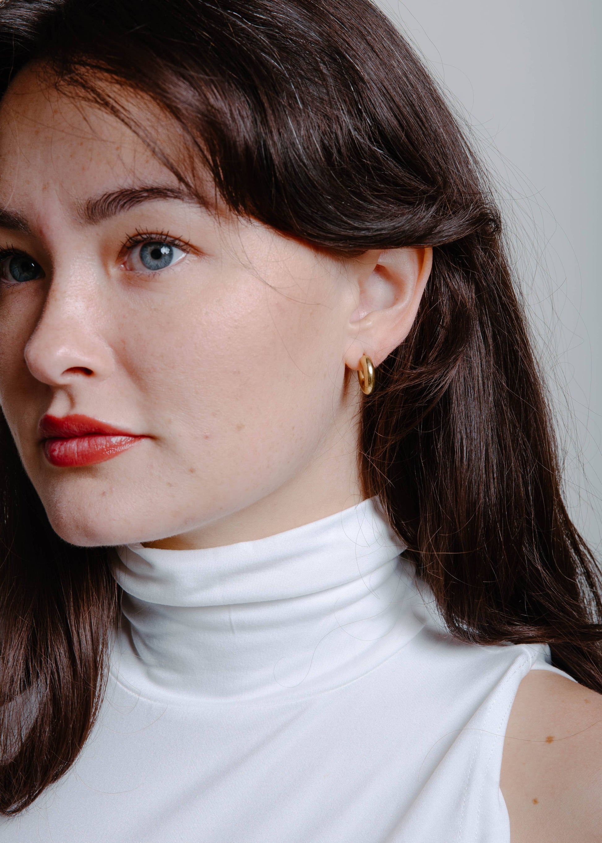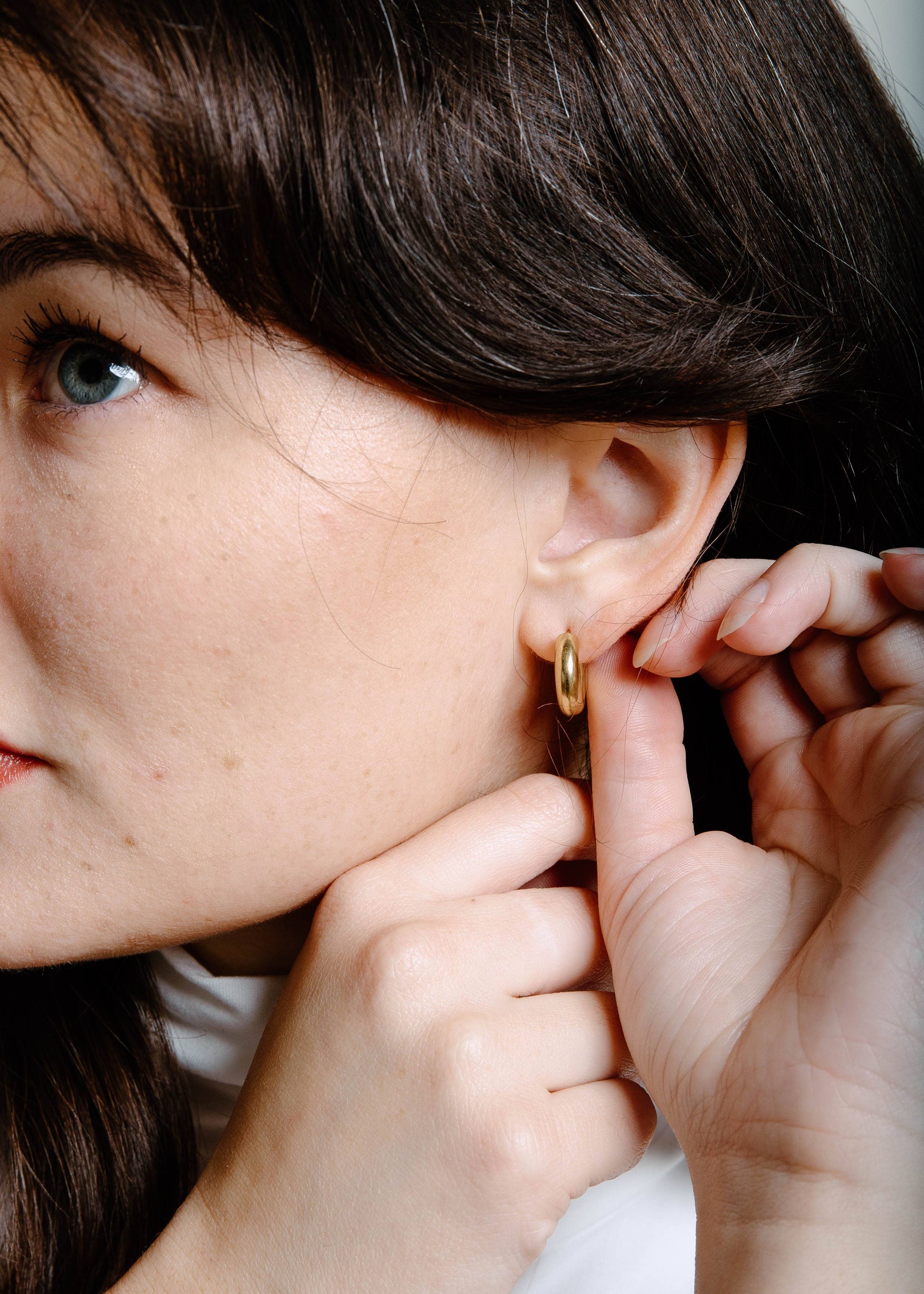 a refined gold hoop with a softly curved silhouette and polished finish. subtle in scale but intentional in shape, this pair adds just enough warmth and structure for everyday wear. designed to sit close to the ear, they’re easy to style on their own or as part of a layered look. crafted in stainless steel, these are waterproof, tarnish resistant, and hypoallergenic for all-day comfort. designed by vincent, a woman-owned and nashville-based brand known for creating attainable, durable jewelry made to be worn often.